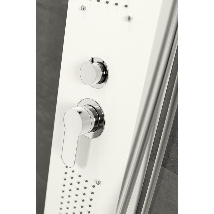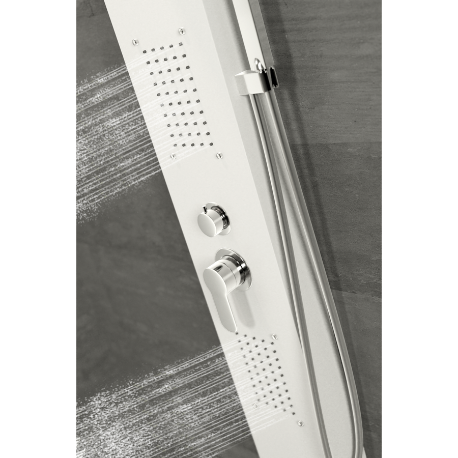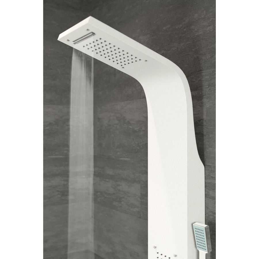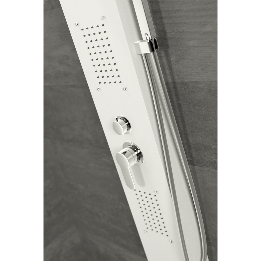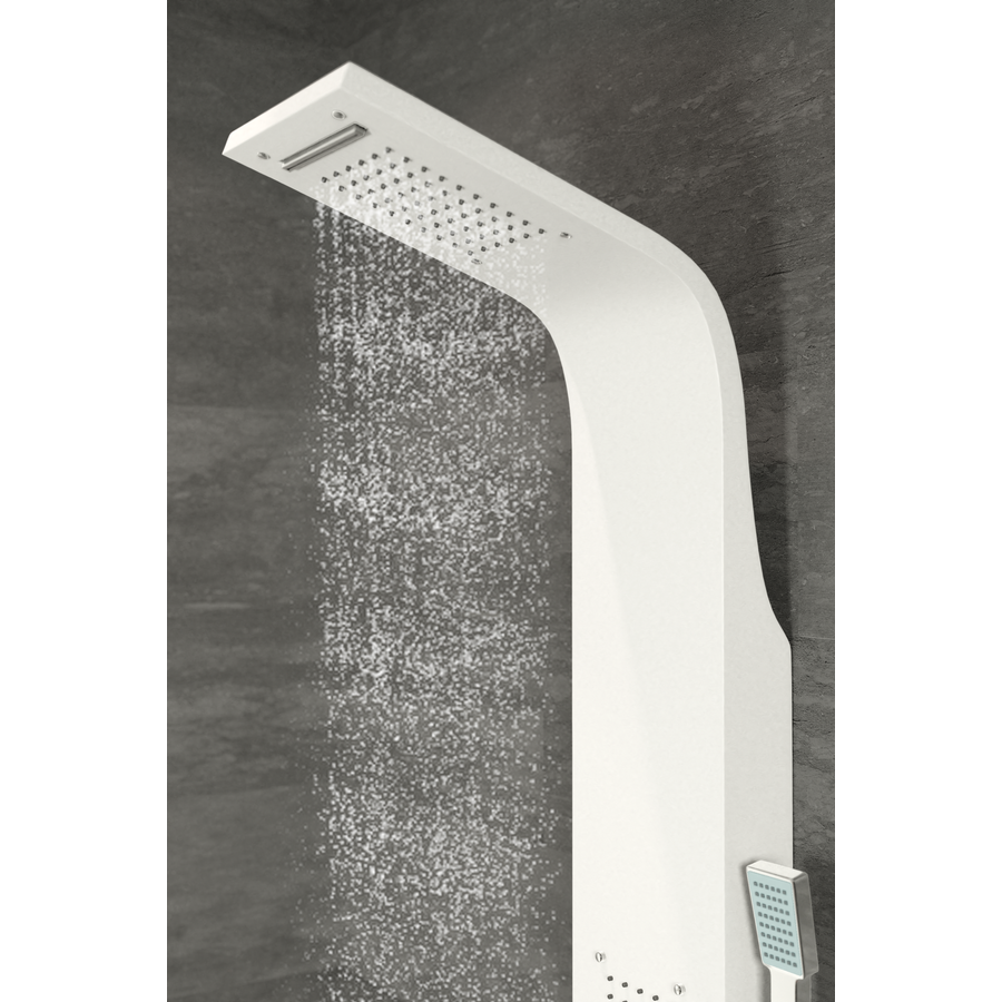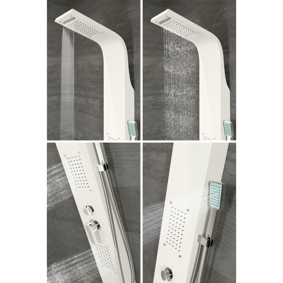 Zuhanypanelünk rozsdamentes acélból készült (304), mely hosszú élettartamot biztosít a panelnek. A víz intenzitása könnyedén szabályozható az egykaros mechanikus keverő csapteleppel, a váltószelep négy fajta zuhanyzási módot kínál, melyek egyszerűen beállíthatóak: trópusi esőztető, zuhatag masszázs, 2 db integrált masszázsfúvóka, elegáns krómozott kézi zuhanyfej. A szilikon fúvókák és a rozsdamentes gégecső ellenállnak a vízkő lerakódásának. A modern test kialakítása követi a legújabb trendeket, melynek egyik fontos eleme, hogy az esőztető fej íveltsége biztosítsa az Ön számára a tökéletes vízsugár magasságának beállítását. Tapasztalja meg Ön is ennek a letisztult stílusú zuhanypanel-rendszernek a használatával.